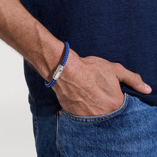 Artisan handcrafted in reclaimed sterling silver with technical woven rubber and a pop of enamel.