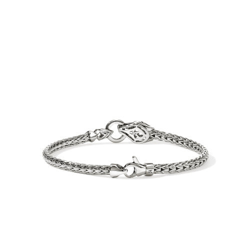 A graphic chain bracelet featuring the hand-carved Naga dragon—a legendary Balinese symbol of love, protection and prosperity. Artisan handcrafted in 100% reclaimed sterling silver with ethically sourced diamond accents and blue sapphire eyes.