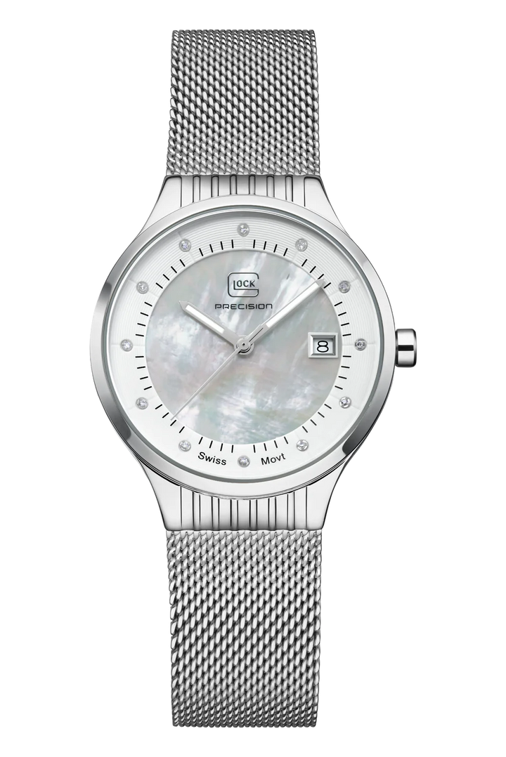 This watch radiates classic elegance. Its shiny, silver-tone stainless steel case and the color-coordinated mesh strap surround a reliable Swiss movement. The white mother-of-pearl dial, adorned with twelve genuine diamonds and featuring hands with Super-LumiNova®, adds an extra layer of luxury. With a 10 ATM water-resistance rating, it combines high-end functionality with classic design.