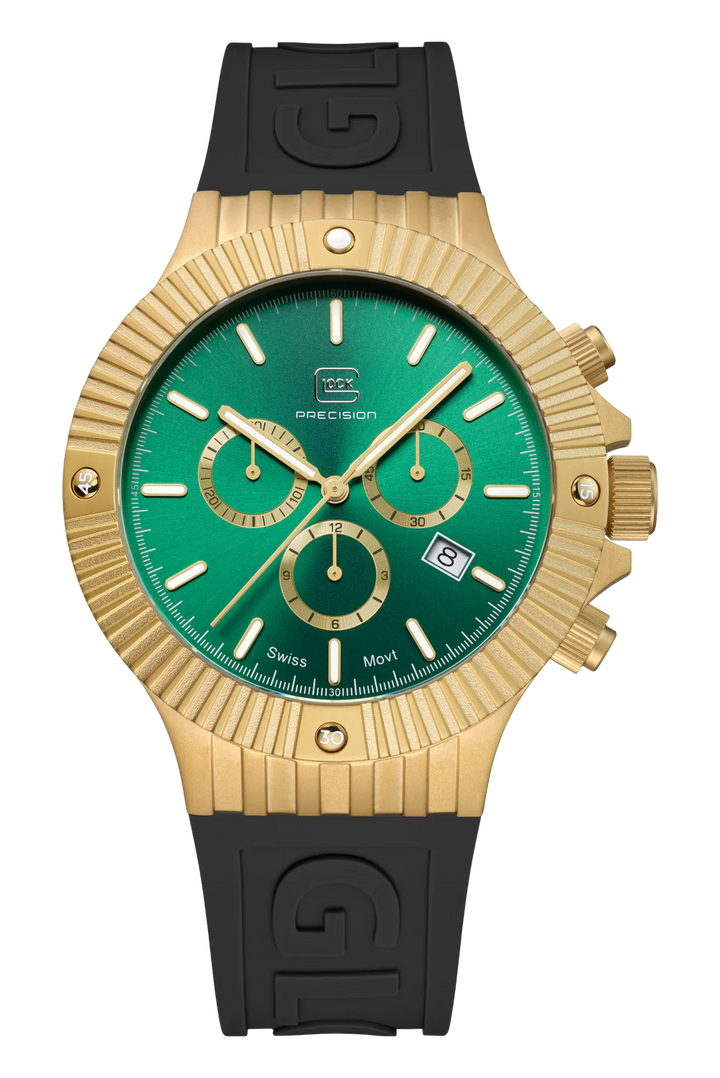 This watch captivates with its gold-tone stainless steel case and its striking interplay of colors. A green sunray dial under scratch-resistant sapphire crystal forms a harmonious blend with the athletic, black silicone strap featuring GLOCK lettering. Hands and indices with Swiss Super-LumiNova® ensure clear readability. Powered by a Swiss movement, this watch offers precision and reliability. Its chronograph function and 20 ATM water resistance combine impressive technical standards with a compelling design.