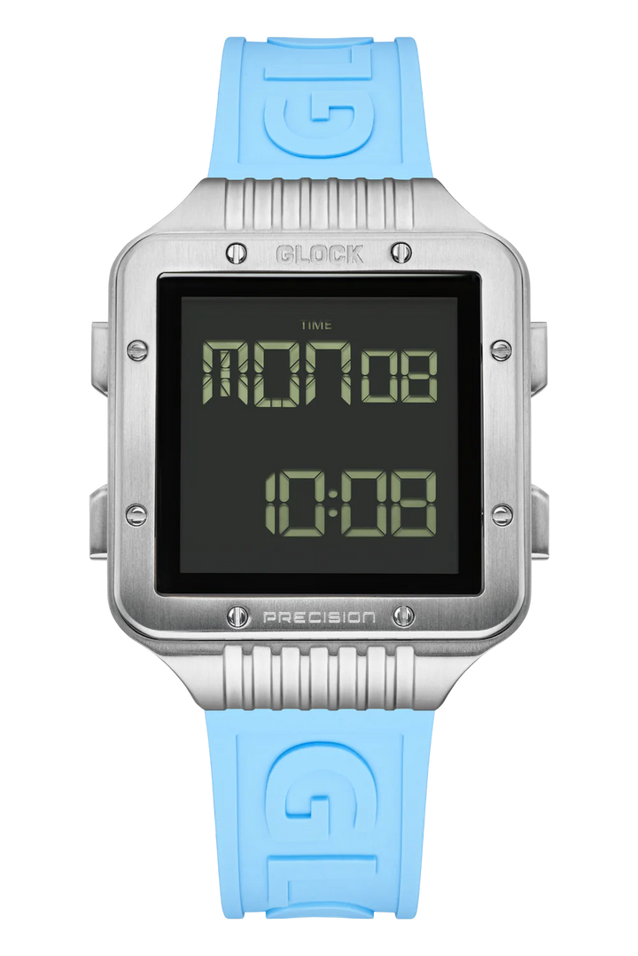 This digital watch features a square stainless steel case surrounding a digital display against a black backdrop. The light blue silicone strap with distinctive GLOCK lettering strikes a balance between comfort and a sporty aesthetic. With a sapphire crystal, a chronograph function, and a 10 ATM water-resistance rating, it stands out with its array of technical features.