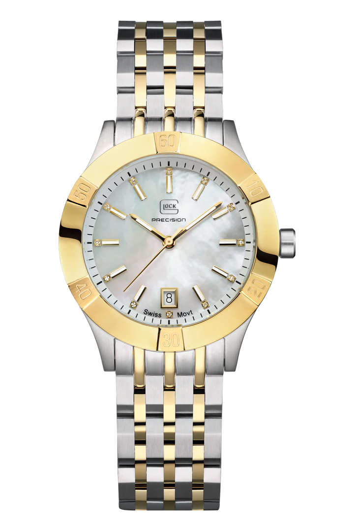 The brushed stainless steel case is highlighted by a polished gold-tone bezel. The two-tone link strap elegantly complements a white mother-of-pearl dial, illuminated by hands and indices with Swiss Super-LumiNova®. With a precise Swiss movement and a reliable 10 ATM water-resistance rating, this watch fuses functionality with style.