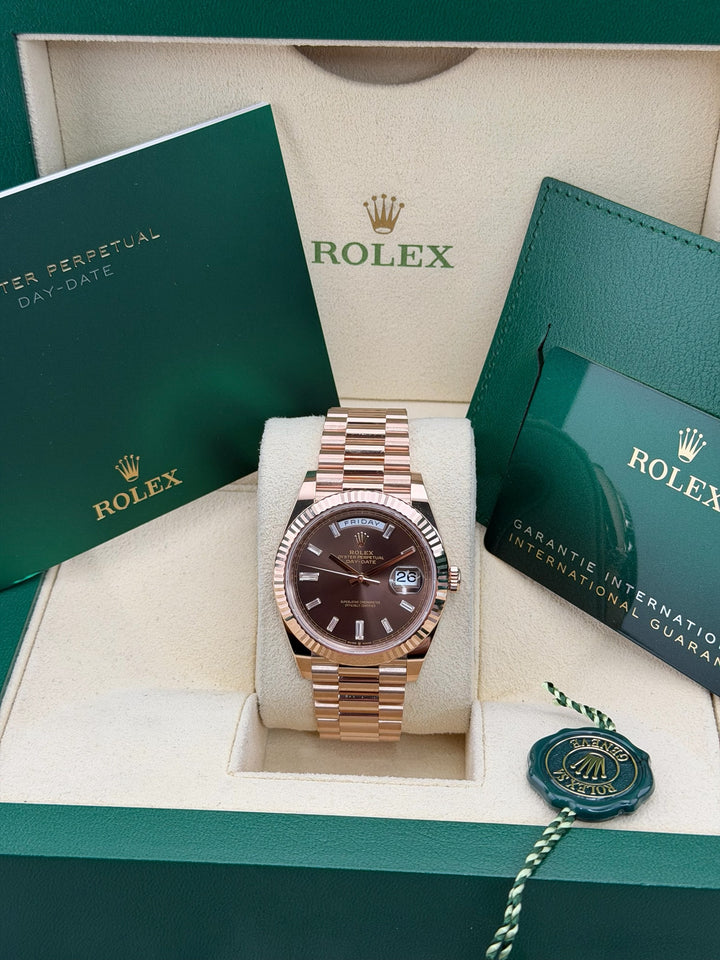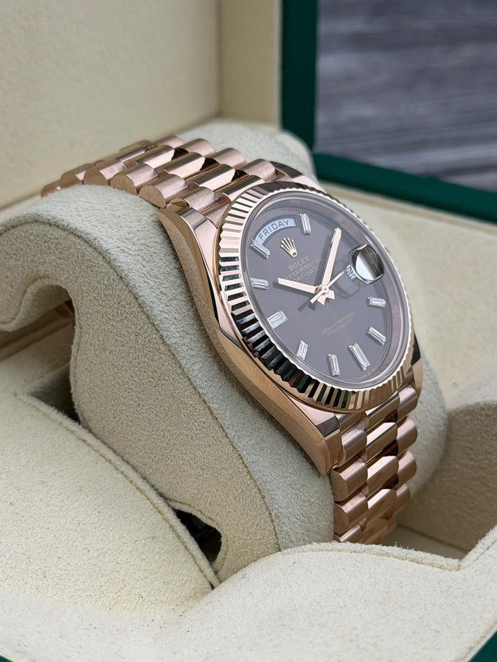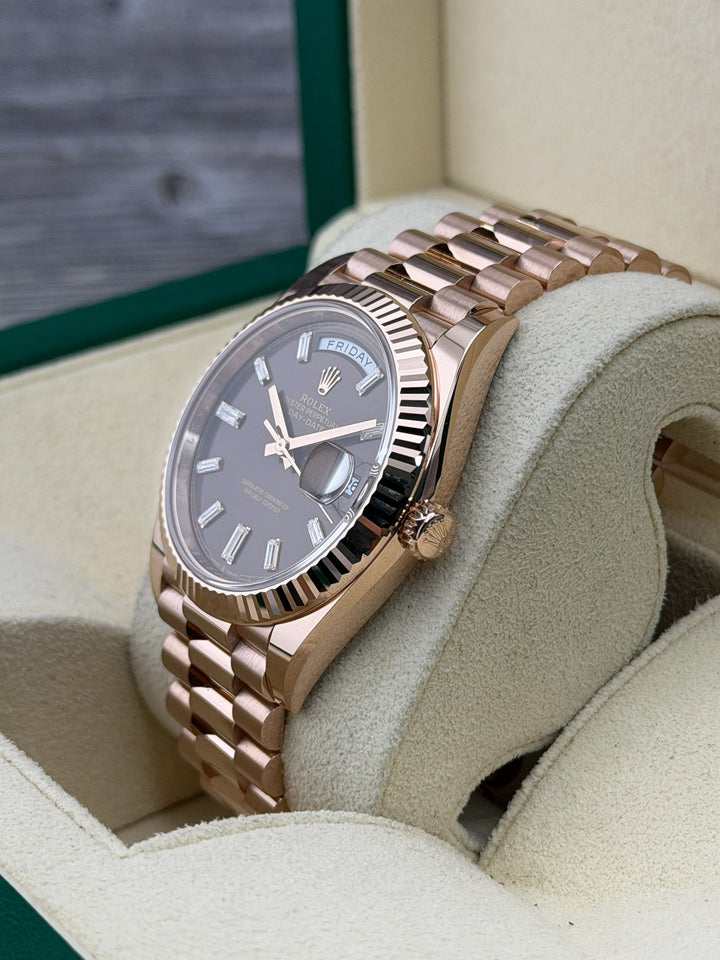 Rolex DayDate Presidential, 18K Rose Gold, 40mm, 228235, Chocolate Diamond Dial, 2025 Box and Papers
